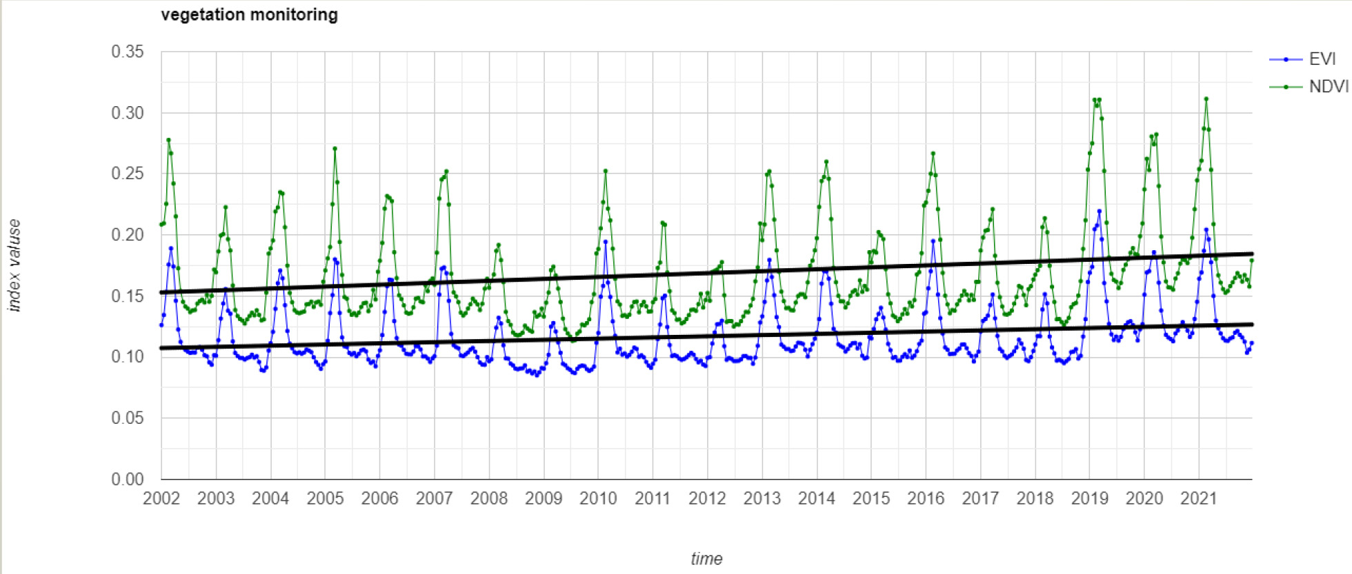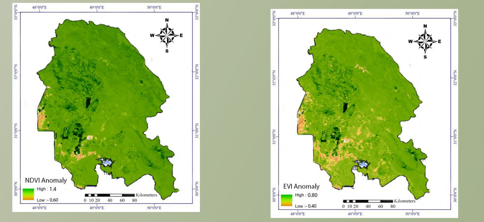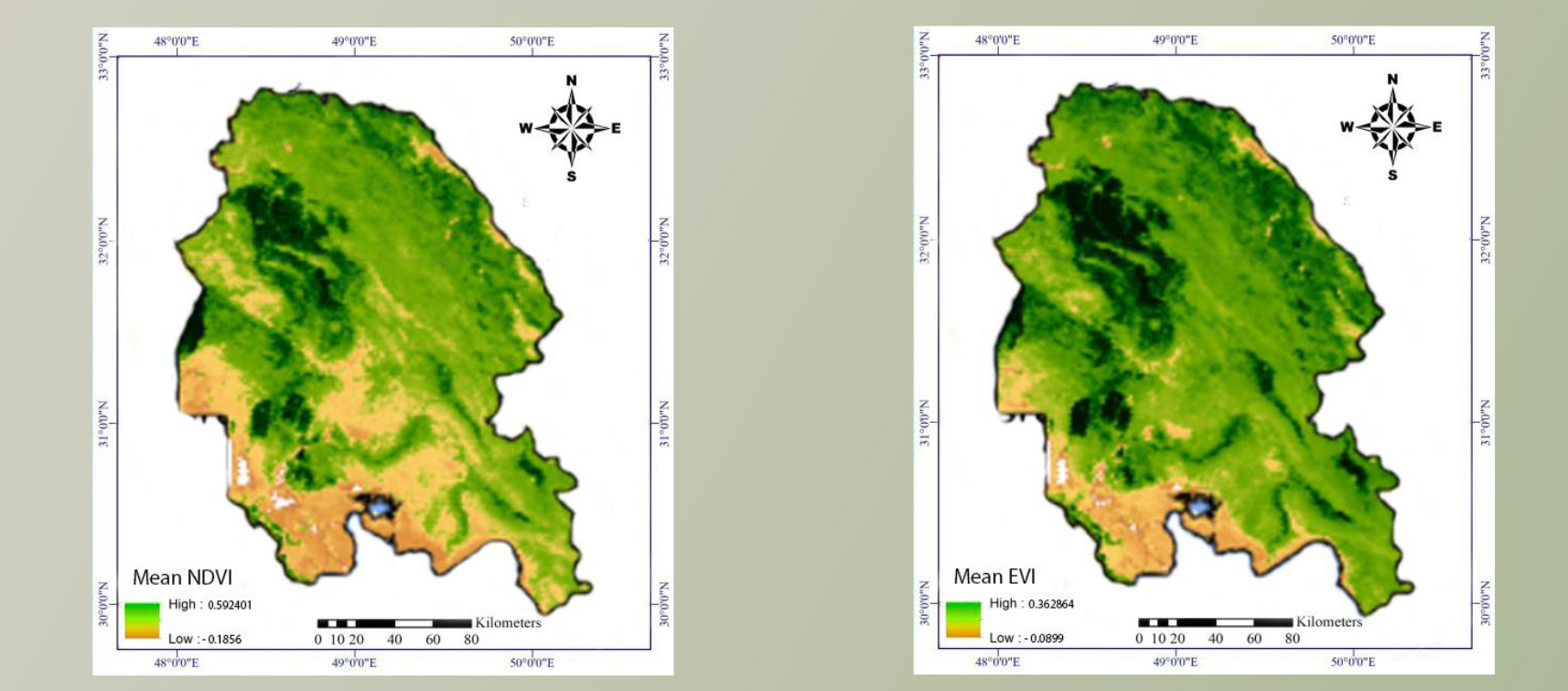 Vegetation change is one of the key indicators used to monitor environmental quality. Monitoring vegetation changes in arid and semi-arid regions is of particular importance due to the rare and sensitive nature of vegetation. Due to expected changes in vegetation, land productivity and biodiversity may be affected. In this direction, the use of time series of vegetation indices (EVI and NDVI) is used as a method to reflect the state of growth and phenology of vegetation. In this project, the multi-temporal products of the MODIS sensor (Terra satellite) including NDVI and EVI indicators have been used during the years 2002 to 2022. The studied area in this project is Khuzestan province. This province is in the southwest of Iran and in the geographical position of 38.4 It is located at 41° 48 north latitude and 31° 28° east longitude. The main reason for choosing this area is the height difference in the two northeastern parts of the province and the southern and southwestern parts, which creates two different types of climate in a short distance. has brought. In the chart of time changes, we see a shift between two indicators. The reason for the shift is the influence of the NDVI index on atmospheric noise and background soil. While the EVI index improves biomass estimation due to having correction coefficients under saturated conditions, this overestimation is also seen in the results of the maximum average and median maps related to the NDVI index, for example, the average map is visually We have shown that in the generated anomaly map, the points with high values of the index have appeared in green, and this shows that the values of the EVI or NDVI index in these areas were increasing over time, and the points with very low values and It has appeared in orange color and indicates that the values of the indicators have decreased over time.